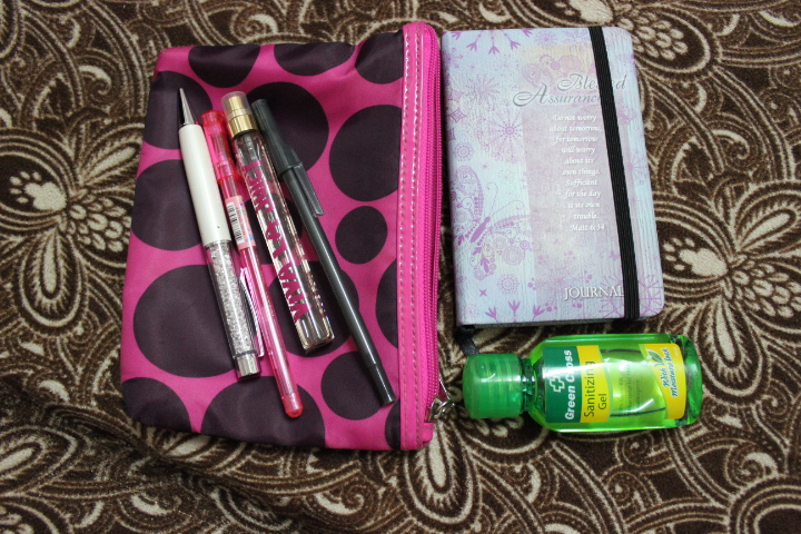 Pouch #1 : Small Notebook, 3 different pens, Viva la Juicy travel perfume and another green cross hand sanitizer :)
